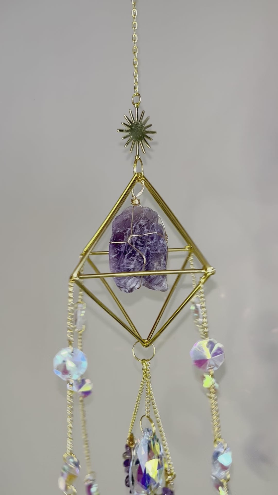 Our sun catcher hangings are handmade with care. There is a raw crystal in the centre and mini raw chips around the base for design.