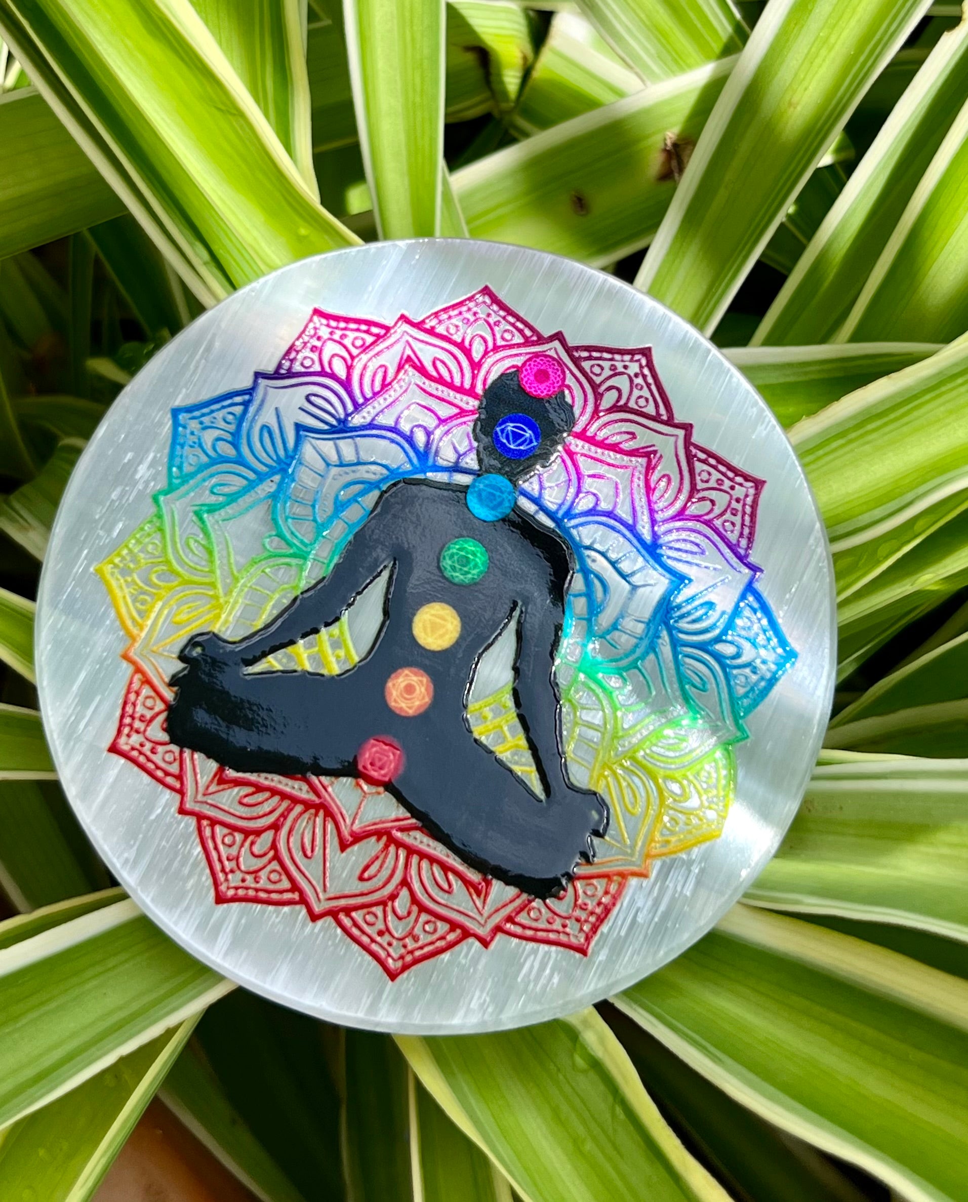 Elevate your meditation practice with our Selenite Meditation Chakra Plate. This stunning selenite plate features a vibrant, colorful engraving of the seven chakras, designed to align and balance your energy centers. Known for its cleansing and purifying properties, selenite is the perfect companion for clearing stagnant energy, making it an essential tool for meditation, crystal healing, or even as a decorative piece in your sacred space. Place your crystals on the plate to cleanse and recharge them, or use it during meditation to amplify your connection to your inner self. Experience a deeper state of harmony with this elegant chakra plate.